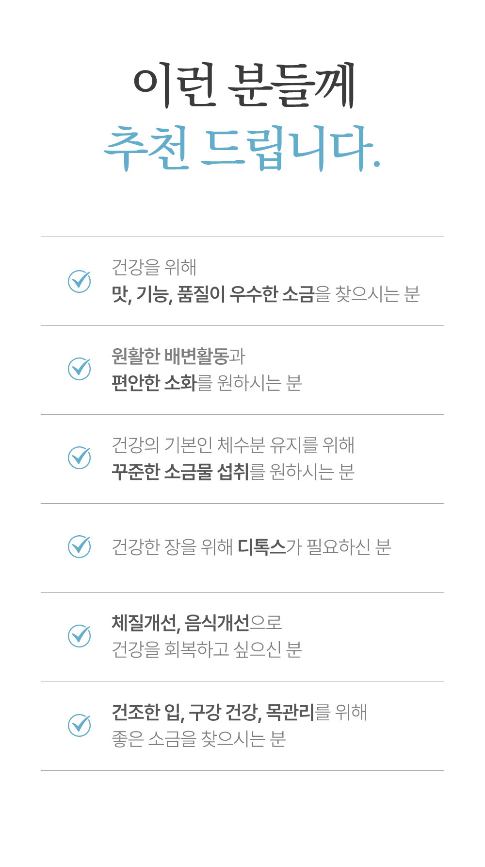 본 제품은 1,000℃ 고열에서 200시간 동안 녹여각종 불순물을 제거한 깨끗한 소금입니다.(200시간은 8일 8시간 동안 녹인 시간입니다.)식품유형 : 용융가공소금제조원 : 주)선맥성분 : 염화나트륨 99%이상포장재질 : 복합다층필름내용량 : 1g * 60포용 도 : 휴대용 소금