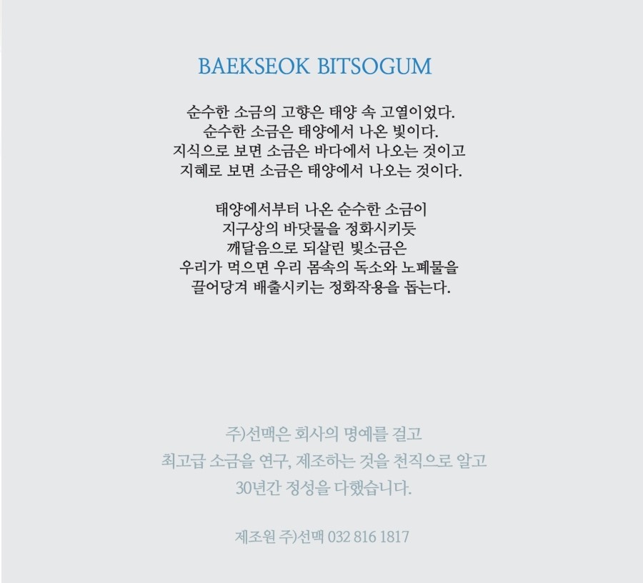 본 제품은 1,000℃ 고열에서 200시간 동안 녹여 각종 불순물을 제거한 깨끗한 소금입니다.